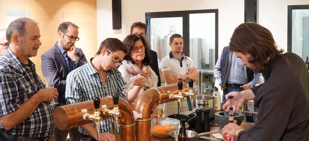 Haubenkoch Michael Ritter, von der Kochagentur in Götzis, kreierte ein exzellentes, bieriges Menü und erklärte den Teilnehmern beim Empfangscocktail MOHRjito die richtige Handhabung beim Kochen mit bierigen Rohstoffen. Gemeinsam mit Geschäftsführer Heinz Huber entdeckten die Gäste die Wurzeln des Geschmacks und durften Michael Ritter hautnah dabei zusehen, wie er kulinarische Höhepunkte für sie zauberte.