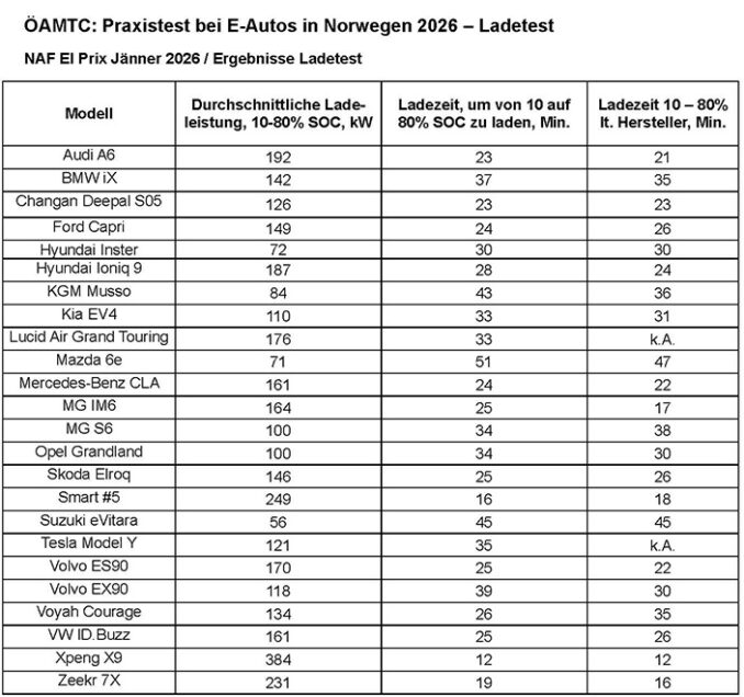 Beim Aufladen erreichten 13 der 24 getesteten Fahrzeuge den gewünschten Ladestand von 80 Prozent in weniger als 30 Minuten. Sechs Fahrzeuge waren sogar schneller auf 80 Prozent als vom Hersteller angegeben. „Bei diesem Ladetest zeigte sich, wie wichtig eine gut temperierte Batterie für das Laden eines Elektrofahrzeuges ist. Trotz Temperaturen von minus zehn Grad Celsius an den Ladestationen haben die getesteten Fahrzeuge gut abgeschnitten“, erklärt Merker. Laut der Erfahrung des ÖAMTC werden in Zukunft Ladegeschwindigkeit, Verbrauchseffizienz und Verfügbarkeit von Ladestationen wichtiger sein als die maximale Reichweite eines Elektrofahrzeuges.