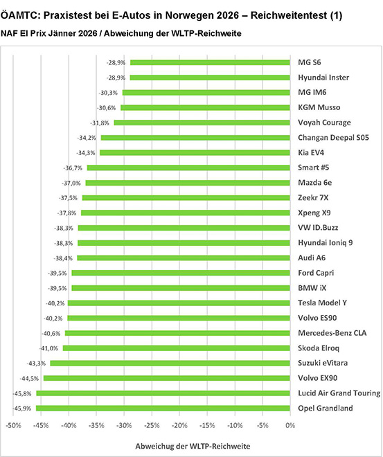 Im Jänner 2026 war der ÖAMTC wieder beim weltweit größten Reichweitentest von Elektrofahrzeugen „El Prix“ dabei. Dieser Praxistest wird jährlich zweimal vom norwegischen Partnerclub NAF durchgeführt. „Bei Rekordwerten von bis zu minus 31 Grad Celsius zeigte sich die starke Auswirkung der niedrigen Temperatur auf die Reichweite von E-Autos: Kein Fahrzeug kam in die Nähe der angegebenen WLTP-Werte. Die höchsten Abweichungen zur angegebenen Reichweite lagen bei fast 46 Prozent, etwa bei Opel Grandland und Lucid Air Grand Touring, die niedrigste bei knapp unter 30 Prozent – bei MG S6 und Hyundai Inster. Im Durchschnitt lag die Abweichung bei knapp 38 Prozent unterhalb der WLTP-Reichweite“, fasst ÖAMTC-Techniker Florian Merker zusammen.