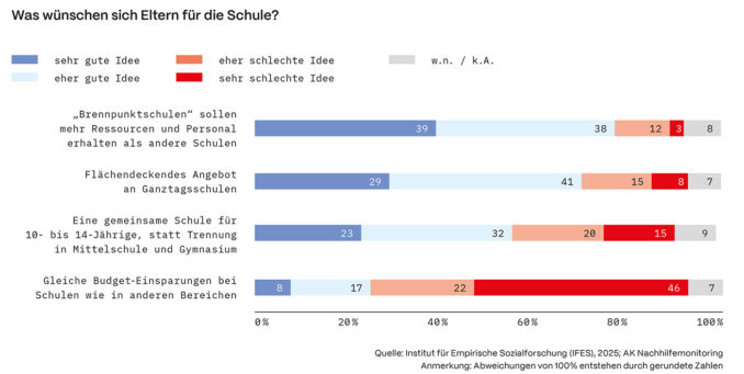 Rund 11 Prozent aller Schüler:innen hätten laut IFES-Befragung gerne eine schulische Nachmittagsbetreuung gehabt – regelmäßig oder manchmal –, diese aber nicht erhalten. Haupthindernisse: zu hohe Kosten (46 Prozent) und fehlendes Angebot am Schulstandort (25 Prozent). Die gute Nachricht: 89 Prozent erhalten entweder bereits Betreuung oder brauchen keine.