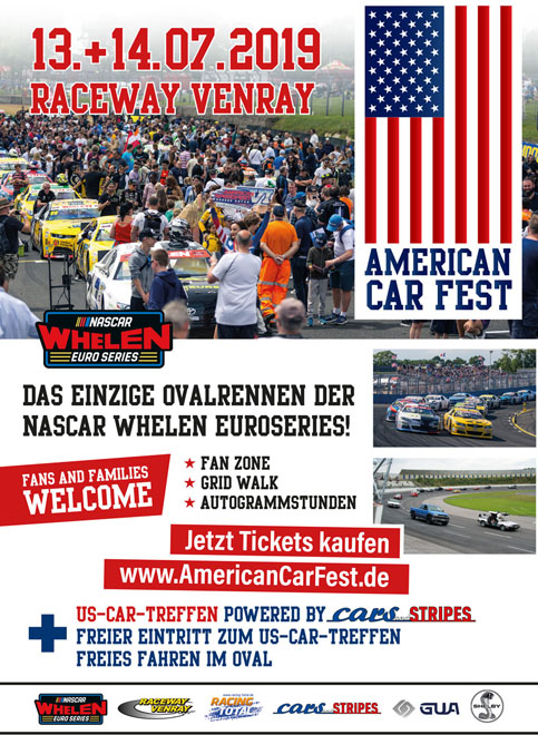 Nascar-Rennen sind schnell. Nascar-Rennen sind laut. Nascar-Rennen sind voller Action, die Racing- und US-Car-Fans das hochoktanige Blut in den Adern kochen lässt. Die Nascar Whelen Euro Series bringt die typisch US-amerikanische Motorsport-Art nach Europa! Und das einzige Ovalrennen der diesjährigen Nascar Whelen Euro Series findet am Wochenende 13. / 14. 7.2019 auf dem 1/2-Meilen-Oval des Raceway Venray, gelegen nur rund 25 Kilometer hinter der deutsch-niederländischen Grenze, statt. Im Rahmen des Actiongeladenen Rennwochenendes wird auch das American Car Fest stattfinden, ein hochkarätiges US-Car-Treffen, ausgerichtet vom Szene-Magazin Cars & Stripes aus dem Portfolio des W.P. Europresse Verlags.