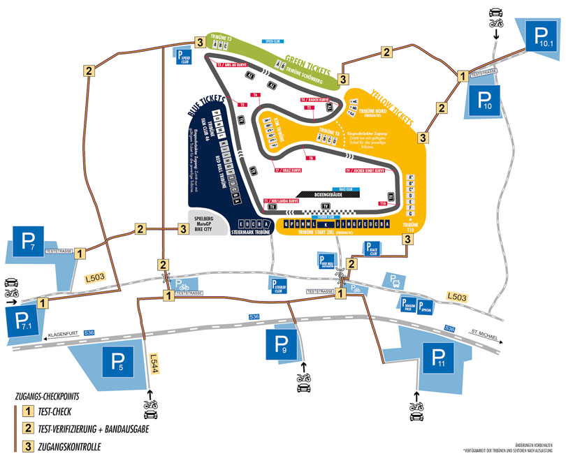Bei jedem Erst-Zutritt zum Veranstaltungsgelände pro Tag (ab einem Alter von 12 Jahren) ist ein gültiger Nachweis über die Erfüllung der 3G-Regel (getestet, geimpft, genesen) erforderlich. Um Wartezeiten vor Ort zu vermeiden, wird empfohlen, bereits mit einem gültigen Testergebnis bzw. Nachweis oder mit dem „Grünen Pass“ anzureisen. Nachweise werden ausschließlich auf Deutsch und Englisch akzeptiert. Direkt an den Parkplätzen stehen Teststraßen mit Testangeboten gegen Entgelt zur Verfügung (Antigen-Test 33 Euro / PCR-Test 99 Euro) – Voranmeldungen unter www.teststrasse.at sind möglich. Detaillierte Informationen (Anreise, Covid-Bestimmungen, Zutrittsregelung, etc.) gibt es im FAQ-Bereich für die MotoGP unter www.redbullring.com.