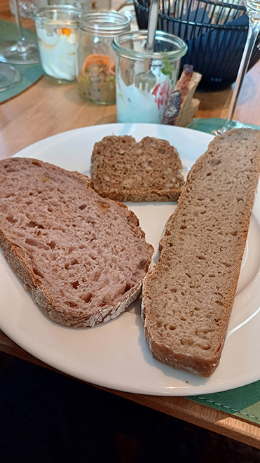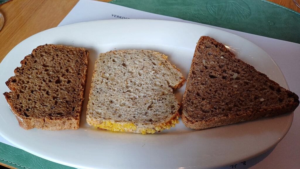 „Spannender Vergleich“ nannte sich das erste Brotsortiment aus Dinkel-Chiabrot, Arlberger Hüttenbrot und Skiclubbrot. Dazu verschiedene Aufstriche und Butter, sowie kleine Leckereien wie Bauernsalat und Linsensalat im Glas – Butter, Sardellen, Zitronenzesten auf Hüttenbrot – ein besonderer delikater Happen!