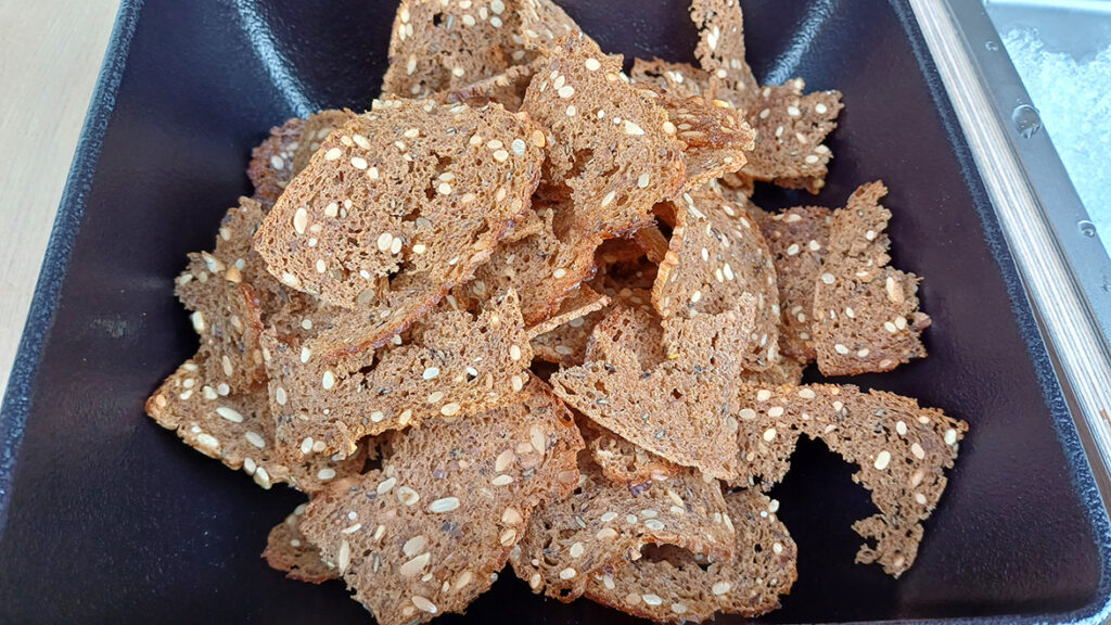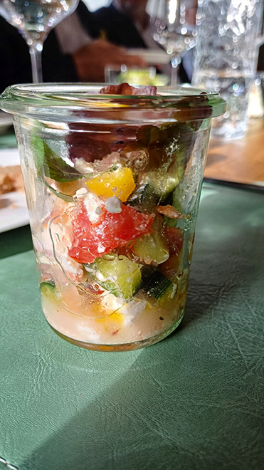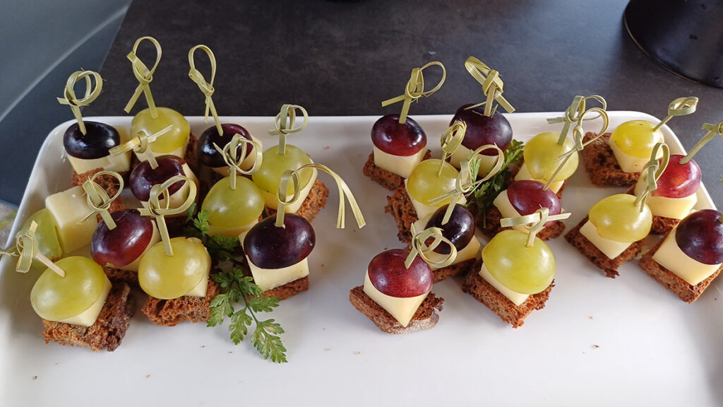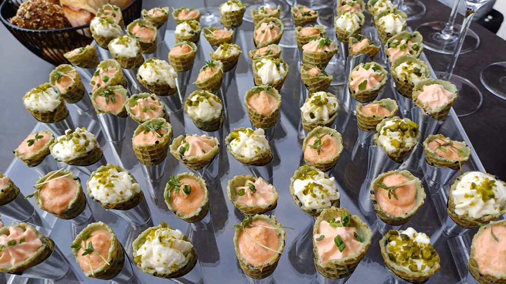 Schon der Aperitif – ein „Pink Rosé – Sekt“ Brut nach Methode Traditionelle verwöhnte mit feiner Perlage, einladender Frucht, Frische, feiner Mineralik und hoher Trinkfreude. Dazu knapperte man knusprige Brot-Chips vom Dinkelwurzel-Baguette, Älplerbaguette und Parisette-Baguette. Bei diesem Genuss vergisst man jegliche Chips-Angebote, die man sonst so gewöhnt ist! Zur Abrundung gab es Brotstanitzel mit Lachsmousse, Frischkäse und Tomatentopfen gefüllt und Käse-Trauben-Sticks auf Vollkornbrot.