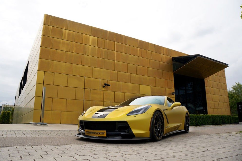 Absolutes Highlight des GeigerCars.de-Umbaus ist der speziell entwickelte Bodykit aus ultraleichtem Kohlefaser, der zudem maßgeblich zur Verbesserung der Aerodynamik beiträgt. Für die Frontpartie gibt es einen Frontsplitter mit zusätzlichen Flaps links und rechts sowie einen Frontgrill inkl. Gitter. Ein Satz neuer Schweller führt die Luft seitlich an der C7 vorbei. Dem Heck spendiert GeigerCars.de ein Heckstoßstange mit Diffusor sowie einen Heckspoiler. Abgerundet werden die optischen Verbesserungen durch eine exklusive Sonderlackierung in „Motorsport-Gold“.