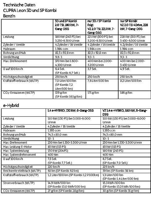 Wer sich für den Cupra Leon mit aufgeladenem 2,0-Liter-Benzinmotor entscheidet, kommt in den vollen Genuss der gesamten Cupra DNA: Der Cupra Leon VZ 2.0 TSI sorgt mit seinen 221 kW (300 PS) in fast allen Drehzahlen und Fahrsituationen für souveränes Vorankommen – und für das vollendete Cupra Feeling. In Zahlen: Für den Sprint aus dem Stand auf Tempo 100 vergehen nur 5,7 Sekunden und erst bei 250 km/h endet die Beschleunigung. Die Kraftübertragung übernimmt bei dieser Motorisierung ein komfortables 7-Gang-DSG, das wahlweise dem Fahrer oder der Motorelektronik das Einlegen der Fahrstufen überlässt. Der Cupra Leon VZ 2.0 TSI ist derzeit nur als Fünftürer ab 42.990 Euro erhältlich. Der SP Kombi wird in dieser Motorisierung erst in den nächsten Wochen bestellbar sein..