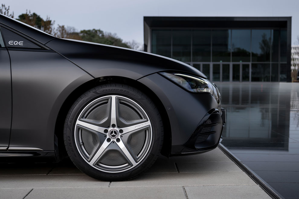 Der EQE hat ein sportliches Purpose-Design mit allen typischen Elementen von Mercedes-EQ, einer One-Bow-Linienführung und Cab-Forward-Design. Sinnliche Klarheit spiegelt sich in großzügig modellierten Flächen, reduzierten Fugen und nahtlosen Übergängen (Seamless Design) wider. Die Überhänge und der Vorbau sind kurzgehalten, das Heck bildet den dynamischen Akzent mit einer scharfen Abrisskante. Die außenbündig positionierten Räder in den Dimensionen von 19 bis 21 Zoll verleihen dem EQE zusammen mit einer ausgeprägten muskulösen Schulterpartie einen athletischen Charakter.