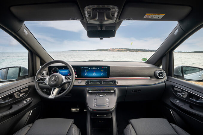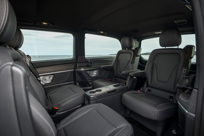 Die ebenfalls neu gestaltete Mittelkonsole unterstützt die Möglichkeit zum kabellosen Laden von Smartphones. Weitere neue, teilweise optionale Komfort-Features sind die Keyless Start Funktion, die Lenkradheizung und eine gedimmte Fondbeleuchtung für Fahrten in der Nacht. Die Ambientebeleuchtung bietet mit 64 Farben eine noch individuellere und wohnlichere Atmosphäre. Für einen komfortableren Zugang in den Fond haben V-Klasse und EQV nun auch auf der linken Fahrzeugseite serienmäßig eine Schiebetür.