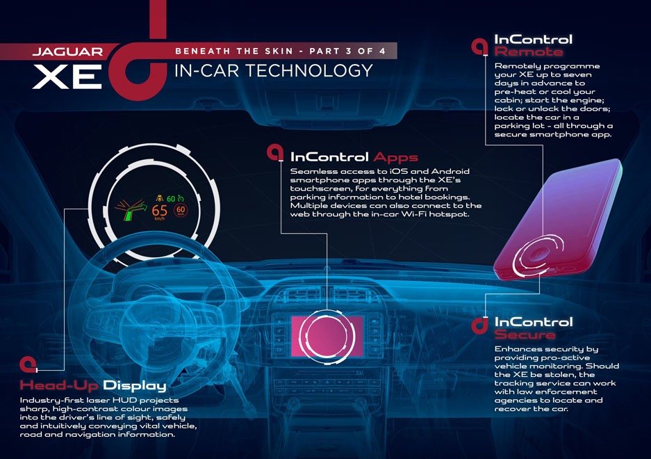 Smartphones haben die Kommunikation zwischen Benützern und der sie umgebenden Welt radikal verändert – auch der neue Jaguar XE garantiert, dass seine Fahrer allzeit „connected” bleiben. Jaguar InControl Remote erlaubt es Inhabern von Apple iOS- und Android-Smartphones, sich unabhängig vom jeweiligen Standort mit ihrem Jaguar XE zu verbinden und aus der Ferne eine Reihe von Fahrzeugfunktionen zu steuern. Dazu zählen eine Fernprogrammierung der Klimaanlage für die Dauer von sieben Tagen, das Ent- oder Verriegeln der Türen oder das Anlassen des Motors.