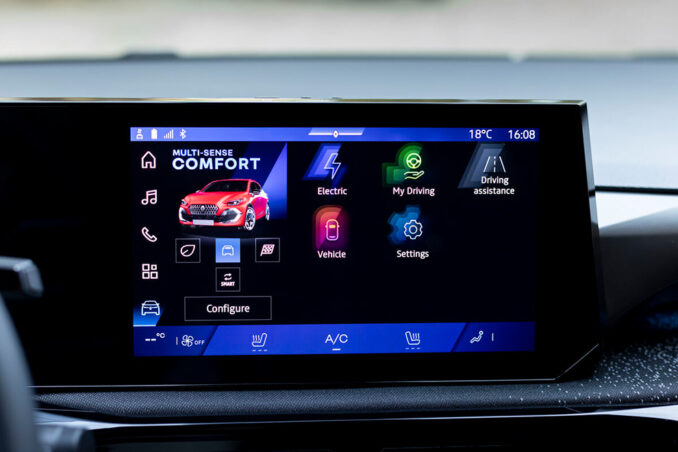 Im geräumigen Innenraum ist der Fortschritt gegenüber den Vorgängergenerationen auf den ersten Blick erkennbar. Fahrerinnen und Fahrer werden je nach Version über einen doppelten 10,1-Zoll-Bildschirm in V-Form mit Informationen versorgt, das kompakte Lenkrad ist vom Renault Austral und Rafale inspiriert. Attraktive neue Materialien und eine Stimmungsbeleuchtung sorgen für eine hochwertige Atmosphäre. Die Beifahrerseite der Armaturentafel ist je nach Ausstattungsvariante mit Textil bezogen, einschließlich einer LED-Ambientebeleuchtung, die die Wahl zwischen 48 Farben bietet. Beim Spitzenmodell Esprit Alpine wird der Textilakzent durch Alcantara ersetzt; der Bereich um die Lüftungsdüsen ist hier zudem mit Hilfe einer innovativen Technik mit einem farbigen Chromverlauf lackiert, der an den Auspuff eines Sportwagens erinnert.