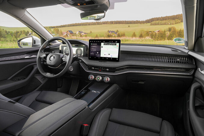 Das Interieur des Superb zeichnet sich durch einen freistehenden, bis zu 13 Zoll großen Infotainmentbildschirm und eine clean gestaltete Mittelkonsole auf. Der Ganghebel rückt an die Lenksäule. Erstmals im Superb bietet Škoda optional ein Head-up-Display an. Die Škoda Smart Dials (digitale Drehregler) und die Sprachassistentin Laura – bald inklusive ChatGPT-Funktionalität – erlauben einen einfachen Zugriff auf zahlreiche Fahrzeug- und Infotainmentfunktionen, die über das Ökosystem des Autos hinausgehen. Neu an Bord ist eine belüftete Telefonbox, die Smartphones mit bis zu 15 Watt induktiv auflädt. Ebenfalls neu: die Ergo-Komfortsitze inklusive Massagefunktion mit zehn pneumatisch gesteuerten Luftkissen. Die neue Angebotsstruktur der Marke umfasst harmonisch abgestimmte Design Selections, optionale Ausstattungspakete und einzelne Zusatzausstattungen. Mit 645 Liter Kofferraumvolumen fasst die Limousine 20 Liter mehr als im Vorgänger. Der Superb Combi schluckt bis zu 690 Liter.