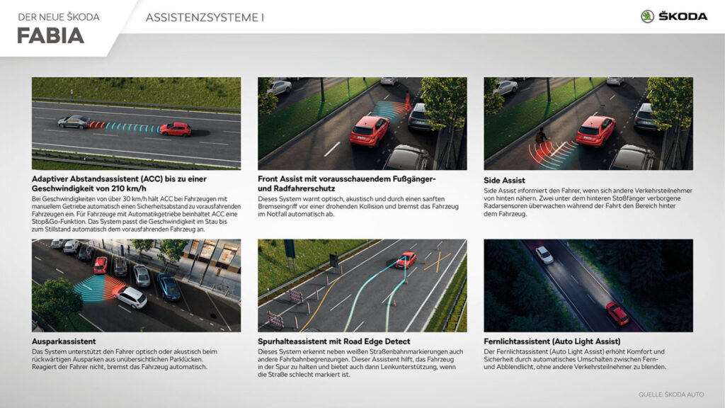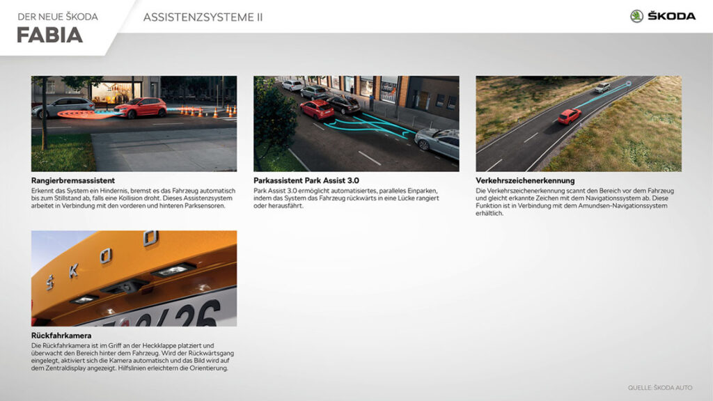 Mit emotionalem Design, neuen Proportionen und noch mehr Platz macht der Škoda Fabia den nächsten Entwicklungsschritt. Die vierte Generation übertrifft zum ersten Mal die Vier-Meter-Marke und bietet nochmals großzügigere Platzverhältnisse. Gleichzeitig setzt der neue Fabia die aktuelle Škoda-Designsprache fort und wirkt mit seinen athletischen Proportionen, skulpturalen Linien sowie scharf gezeichneten Scheinwerfern und Heckleuchten mit LED-Technologie besonders dynamisch. Ausgeklügelte Details wie aerodynamisch optimierte Räder und die aktiv verstellbare Kühlerjalousie im unteren Lufteinlass des vorderen Stoßfängers ermöglichen einen Luftwiderstandsbeiwert von cw 0,28 und damit die Bestmarke im Kleinwagen-Segment.