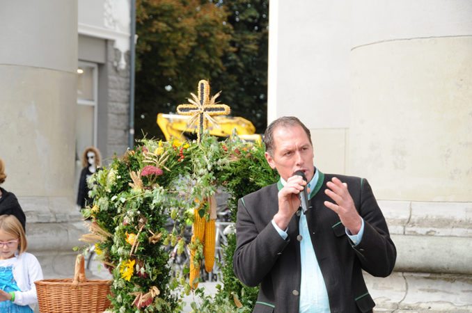 Erntedank und Imkerei waren die Themen bei der Eröffnung am vergangenen Samstag. Wissenswertes rund um die Biene präsentierte der Bienenzuchtverein Dornbirn 1868 unter Obmann Reinhard Spiegel. Jürgen Alber erklärte die Bienenhaltung anhand von Imkerutensilien wie z.B. der Honigschleuder. Mit Unterstützung von Angela Schwendinger konnten Kinder flotte Bienen aus Papier basteln. Familie Ilg aus Dornbirn kümmerte sich mit hofeigenen Produkten wie gebratene Kartoffeln mit Kräutern und Topfenaufstrich, Most und Saft, um die Verpflegung. Violetta Giselbrecht (stv. Gebietsbäuerin Unterland) verteilte zur Feier des Erntedankes mit ihrem Team Äpfel an die Besucher. Pfarrer Christian Stranz fand bei der Segnung der von Rita Wohlgenannt gestalteten Erntedankkrone auch mahnende Worte zu einem sorgsamen Umgang mit den Ressourcen. StR und LK-Präsident Josef Moosbrugger eröffnete den Dornbirner Herbst und bedankte sich bei allen Kunden für ihre Einkäufe direkt beim Bauern. Auch LR Erich Schwärzler betonte, wie wichtig es ist, das Gesicht hinter den Produkten zu kennen und zu schätzen. Für den musikalischen Schwung sorgte die Bauernkapelle Dornbirn.