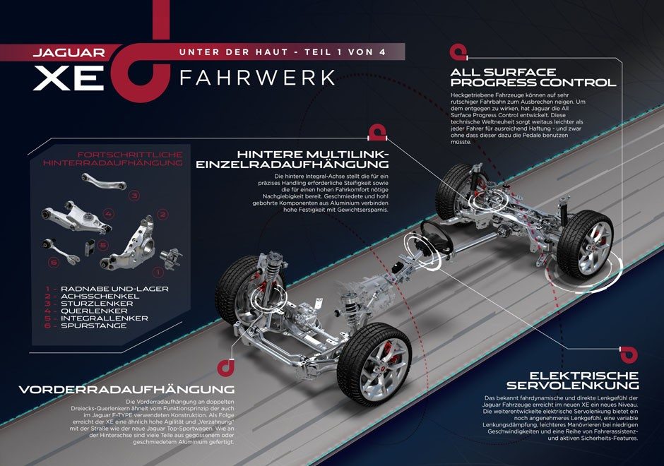 Die Vorderradaufhängung des neuen Jaguar XE ist an einem Hilfsrahmen mit Federbeindomen aus Aluminium-Druckguss montiert. Auch sie liefert ein Maximum an Dynamik und eine überlegene Straßenlage. Für die Fahrwerkskonstruktion wurden Kernkomponenten des sportlichen Jaguar F-TYPE genutzt, um ein maximales Maß an Steifigkeit zu erreichen. So erreicht auch der neue XE Spitzen-Werte für Agilität und ein mit der Straße verbundenes Lenkgefühl.