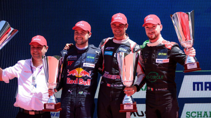 Alles Müller im zweiten DTM-Rennen der Saison 2022! Der Schweizer Nico Müller feierte am Sonnntag in Portimão seinen insgesamt elften Sieg in der DTM. Der 30-jährige landete vor Felipe Fraga im Red Bull AF Corse Ferrari. Der Brasilianer gewann mit 1:41,681 den Autohero Fastest Lap Award und sicherte sich so einen Extrapunkt. Abermals als Dritter kam Mirko Bortolotti im GRT Lamborghini ins Ziel. In der Gesamtwertung führte der Italiener mit 35 Punkten vor Müller (28 Zähler) und Lucas Auer (AUT/26 Punkte). Am Start veteidigte Müller seine Führung auf der Innenseite konsequent gegen Bortolotti, nachdem er bereits im Qualifying am Morgen der Schnellste war. Der Vizemeister von 2019 und 2020 freute sich über seinen ersten DTM-Sieg seit November 2020 in Hockenheim: „Ich bin einfach sehr froh, wir haben so hart dafür gearbeitet. Wir wissen, wie hart diese Meisterschaft in diesem Jahr ist, umso glücklicher sind wir, dass wir diesen Sieg geschafft haben.“ Die 29 Top-Piloten boten auch im zweiten Rennen an der Algarve beste Motorsport-Unterhaltung, zeigten zahlreiche Überholmanöver. Zu den Gewinnern im Rennen zählten Walkenhorst BMW-Pilot Marco Wittmann (GER), der von Platz 7 auf 4 nach vorne fuhr, und Titelverteidiger Maximilian Götz (GER), der im WINWARD Mercedes-AMG von 10 startete und am Ende Fünfter wurde vor Kelvin van der Linde (RSA) im Audi von Team ABT Sportsline. Als bester Porsche-Fahrer kam der Belgier Laurens Vanthoor von SSR Performance auf Platz 7 ins Ziel. Pech hatte der Sieger vom Vortag: Lucas Auer musste nach seinem Pflichtboxenstopp eine Runde später direkt wieder an die Box und kam als 22. ins Ziel. Rallye-Ikone Sébastien Loeb (FRA) beendete das Rennen im AlphaTauri AF Corse Ferrari auf Platz 18, drei Plätze vor ihm landete David Schumacher (GER, WINWARD Mercedes-AMG), der durch einen langen ersten Stint lange führte und am Ende neun Plätze gut machte und von 24 auf 15 nach vorne fuhr. Der Meisterschaftsführende Bortolotti zog nach zwei dritten Plätzen natürlich ein positives Fazit vom Auftakt-Wochenende: „Gestern hat es sich wie eine Niederlage angefühlt, heute ein bisschen wie ein Sieg. Das war ein absolut hart umkämpftes Rennen. Ich freue mich jetzt sehr auf den Lausitzring, die Strecke war in den letzten Jahren gut für mich – auch wenn die DTM-Version mit Turn 1 noch mal herausfordernder ist.“ Die DTM-Saison 2022 umfasst ingesamt 16 Rennen, die nächsten beiden Rennen stehen vom 20.-22. Mai an. Dann jagen die Weltklassefahrer der DTM durch die Steilkurve am DEKRA Lausitzring Turn 1 powered by Autohero.