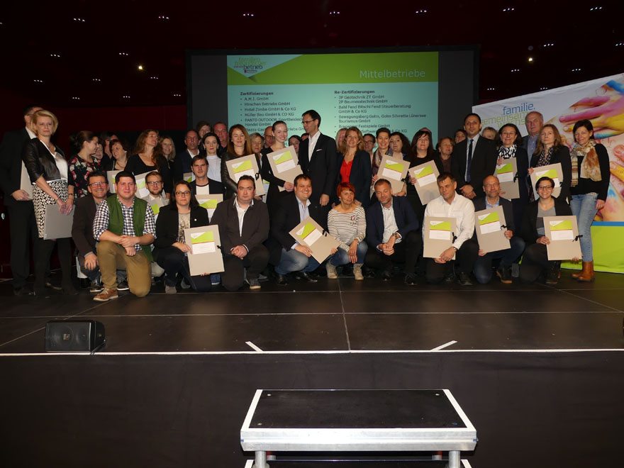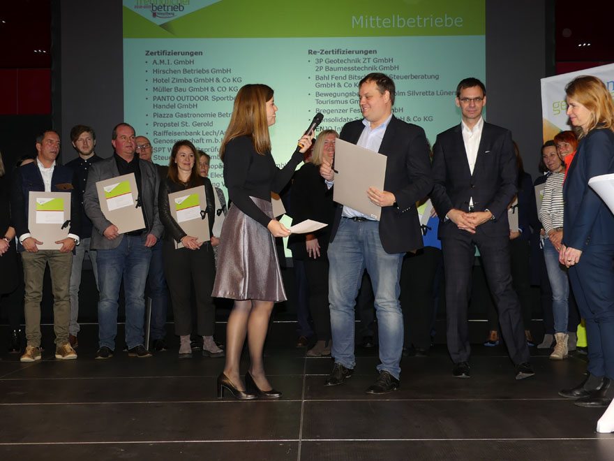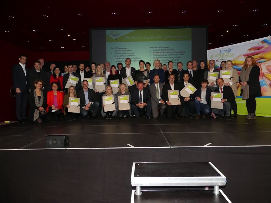 Vorarlbergs Landeshauptmann Markus Wallner ehrte familienfreundliche Betriebe in den Kategorien Kleinbetriebe, Mittelbetriebe, Großbetriebe, Non-Profit-Unternehmen und öffentlich-rechtliche Unternehmen. Bei der bereits zum elften Mal durchgeführten Auszeichnung erhielten 103 Betriebe das Gütesiegel für den Zeitraum 2018-2019.