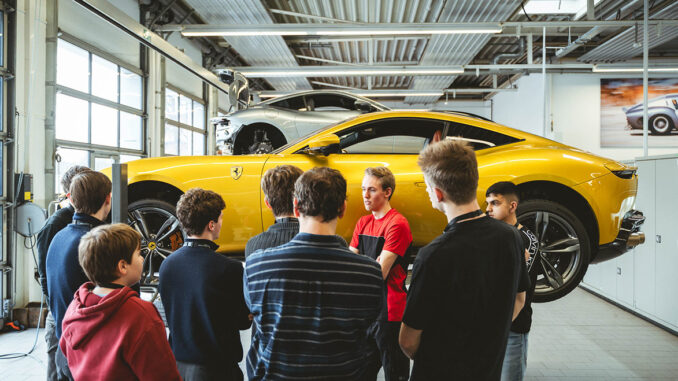 Auch in diesem Jahr erwarteten die Teilnehmenden wieder vielfältige Programmpunkte, die das Arbeiten in einem Ferrari Händlerbetrieb greifbar machen. Den Auftakt bildete eine Einführung in die 79-jährige Historie der Marke, die Ferrari als Sinnbild für technologische Spitzenleistung und automobilen Fortschritt verortet. Im Anschluss erlebten die jungen Gäste praxisnahe Einheiten aus dem Arbeitsalltag eines Ferrari-Mechatronikers: Der richtige Umgang mit Diagnosetechnik, Einblicke in Wartungsprozesse sowie praktische Übungen in den Werkstätten zeigten, was Präzision und technische Kompetenz im Ferrari Alltag bedeuten.