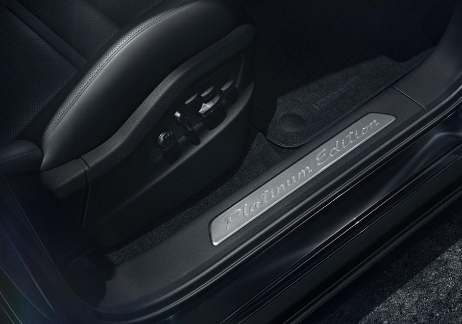 Das edle und exklusive Erscheinungsbild der Editionsmodelle ist von vielen modellspezifischen Details in seidenglänzendem Platinum geprägt. Entsprechend lackiert sind Einleger in den Lamellen der Lufteinlässe am Bugteil, der in das LED-Heckleuchtenband integrierte Porsche-Schriftzug, die Modellbezeichnung am Heck sowie die serienmäßigen, 21 Zoll großen RS Spyder Design-Räder, die ausschließlich der Platinum Edition vorbehalten sind. Sportendrohre und Seitenscheibenleisten in Schwarz unterstreichen die sportlich-elegante Optik der Sonderserie.