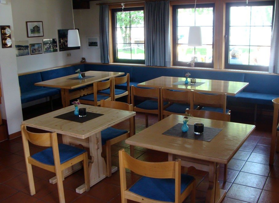 Drei Bedienungen sind am Werk und versorgen routiniert und mit einem Lächeln Radfahrer/innen und Pensionist/inn/en. Im Westen wird gekreischt: Frühlingsfest! Wir erhalten die Karte, die neben Standards u. a. auch Burger-Kreationen aufweist, und bestellen.