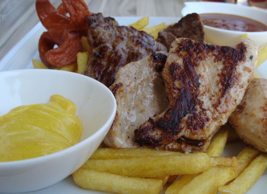 Mein Cola Zero ist der Kühlung zum Opfer gefallen und in der Flasche gefroren. Meine Begleitung erhält ein Achtel Zweigelt um € 2,70. Das nennt man hier „MBC Backbord“ (ergo den Grünen Veltliner „MBC Steuerbord“). Ich starte mit einer klaren Kraftbrühe vom Rind mit Milzschnitten um € 4,50. Die Suppe ist fein würzig, die Milzschnitten vermutlich ein Convenience-Produkt und reichlich angesaugt. Als Hauptspeise bekomme ich einen Grillteller mit Pommes Frites und zweierlei Dips (einer auf Senf-, der andere auf Ketchup-Basis) um € 13,90. Daran gibt es nichts auszusetzen. Das Fleisch (Huhn, Schwein und Rind) ist außen gut gegrillt und ihnen noch saftig. Das Wiener Schnitzel vom Ländle-Schwein mit Pommes um € 11,40 ist gut, hätte aber einen Hauch mehr Salz und Ketchup/Preiselbeeren vertragen. Aus dem Kuchenangebot suche ich eine Rüeblitorte um € 3,- aus. Diese und der Cappuccino um € 3,30 sind tadellos. Das Warten auf den Bezahlvorgang dauert länger als gewünscht. Schließlich sind mit Trinkgeld € 45 fällig, was o.k. ist.