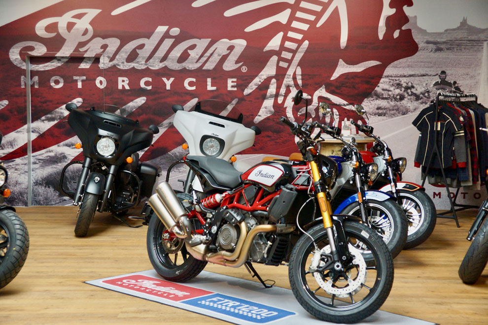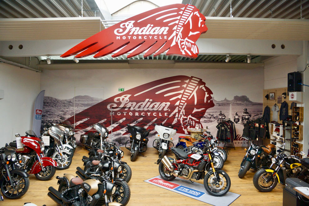 Im August 2018 holte INDIAN GEIGER CARS den Motorradkult in seine Münchner Showrooms. Ein hochmotiviertes und ebenso kompetentes Team steht hier hinter der Kultmarke Indian und macht für Fans der US-Bikes alles möglich – ob bei Beratung und Verkauf, beim Service oder mit reichhaltigem Zubehör. Testfahrten sind jederzeit mit allen Indian-Modellen möglich. Besonders gilt das für die brandneue FTR 1200, ein von amerikanischen Sandbahnrennen („Flat Track“) her inspiriertes Naked Bike mit 123 PS. Karl Geiger schwärmt: „Wer auf der neuen FTR mit 120 Nm die schier endlose Drehmomentwelle reitet, der ist sofort überwältigt.“ Wenn Geigercars etwas in Angriff nimmt, dann bekanntlich richtig. So auch im Falle der legendären Indian Motorcycles: Der Münchner Motorrad-Händler ist auf allen wichtigen Messen vertreten und bei großen Bike-Events präsent, etwa bei der „European Bike Week 2019“ am Faaker See (3. bis 8. September). Jederzeit sind rund 60 Indian-Motorräder bei Geigercars verfügbar. Das Verkaufsziel des erfahrenen Händlers lautet: 100 Bikes pro Jahr. Die Marschrichtung stimmt, denn seit dem Start im August 2018 hat Geigercars schon 70 Indian-Motorräder verkauft.