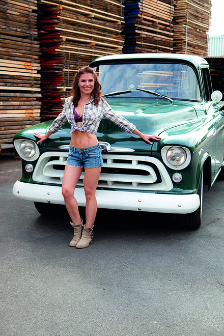 Der dunkelgrüne Chevy Pickup mit weißen Stoßfängern und Felgen verleiht der Szene hingegen einen rockigen 50th-Look in rustikaler Holzfäller-Kulisse. Beide Autos haben wahrscheinlich lange nicht in solch einem Glanz erstrahlt, den besonders die weibliche Präsenz auf die Fotos zaubert. Da wären wir dann vielleicht doch wieder ein Stück weit bei der Männerfantasie!
