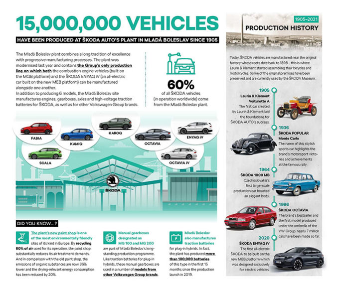 Der Entwicklung des Škoda Auto Stammwerks und das Jubiläum von 15 Millionen gebauten Fahrzeugen ist eng mit dem Eintritt der Marke in den Volkswagen Konzern im Jahr 1991 verbunden, der sich dieses Jahr zum 30. Mal jährt. Allein seitdem entstanden in Mladá Boleslav mehr als 10.700.000 Fahrzeuge. Durch die Zugehörigkeit zu dem Weltkonzern stieg Škoda Auto vom regionalen Marktführer zur global erfolgreichen Volumenmarke auf.