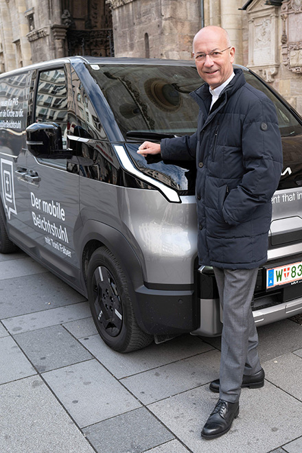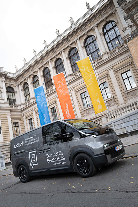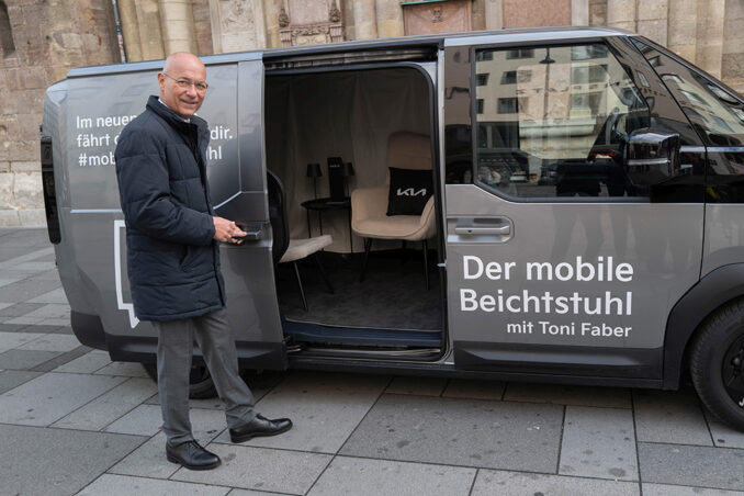 Diesen Herbst präsentiert Kia den neuen PV5. „Auch ein Nutzfahrzeug muss nicht nur praktisch sein, sondern kann auch Raum für Humor, Emotionen und Menschlichkeit bieten“, begründet Christine Heeger, General Manager Marketing von Kia Austria die ungewöhnliche Aktion, die am Montag, dem 10. November 2025 am Stephansplatz startete und über mehrere Stationen bei der Wiener Hauptuni ihren Abschluss fand. Mit gut 4,5 m³ Raum und lokal emissionsfreier Mobilität ist der neue Kia PV5 nicht nur vielseitiger Transporter für kommerzielle Anwendungen, sondern auch prädestiniert als „mobile Kapelle“. Einen mobilen Beichtstuhl, der kreuz und quer durch Wien fährt – vom Stephansplatz über den Naschmarkt und die Mariahilfer Straße bis zur Universität Wien.