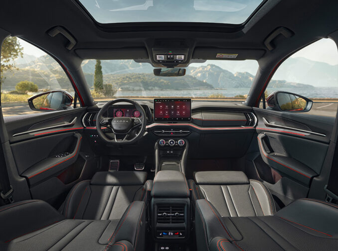 Zur Gestaltung des Innenraums können Kodiaq RS-Kunden zwischen zwei Design Selections wählen. Die serienmäßige Design Selection „RS Lounge“ weist Sportsitze mit integrierten Kopfstützen und schwarzen Mikrofaser-/Kunstlederbezügen mit roten Kontrastnähten auf. Die elektrisch verstellbaren Vordersitze besitzen eine Memory-Funktion. Im Einklang mit dem größten Teil der Inneneinrichtung erscheint der Dachhimmel in sportlichem Schwarz. Die Türeinsätze, die mittlere Armlehne und die sichtbaren Oberflächen des Armaturenträgers zeichnen sich durch einen schwarzen Mikrofaserbezug aus. Die optionale Design Selection „RS Suite“ umfasst ebenfalls Sportsitze mit integrierten Kopfstützen, hier jedoch mit einem perforierten schwarzen Leder-/Kunstlederbezug mit roten Kontrastnähten. Schwarzes Kunstleder ziert auch die sichtbaren Oberflächen des Armaturenträgers, die Türeinsäötze und die mittlere Armlehne. Grundsätzlich besitzt der Kodiaq RS ein Dreispeichen-Multifunktions- Sportlenkrad mit roten Nähten und RS-Emblem. Die Pedalabdeckung aus Edelstahl und Türeinstiegsleisten mit Kodiaq-Schriftzug ergänzen das sportliche Interieur. Die laminierten Glasscheiben der Akustikverglasung vorn und hinten dämpfen Außengeräusche und erhöhen damit den Fahrkomfort. Wie die anderen Versionen der Modellreihe besitzt auch der Kodiaq RS das zehn Zoll große Virtual Cockpit mit freistehendem Infotainmentdisplay im selben Format. Auf Letzterem erscheint beim Einsteigen das RS-Logo. Optional steht als Teil des Technologie-Pakets ein 13 Zoll großer, freistehender Infotainmentbildschirm zur Wahl.