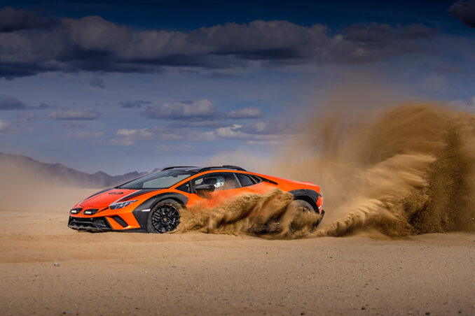 Der abenteuerliche Charakter des Sterrato ist auf den ersten Blick zu erkennen. Die Bodenfreiheit wurde im Vergleich zum Huracán Evo um 44 mm erhöht, um einen größeren Federweg zu gewährleisten, und die Spurbreite vorn (+30 mm) und hinten (+34 mm) vergrößert. Darüber hinaus schützen der vordere Unterbodenschutz aus Aluminium, die verstärkten Schweller, der Heckdiffusor und die robusten Radkästen nicht nur die Karosserie, sondern betonen auch das muskulöse Aussehen. So wie der prägnante Lufteinlass auf der Heckklappe, der einerseits den sportlichen Charakter des Modells unterstreicht und andererseits den Motor auf staubigen Straßen mit sauberer Luft versorgt.