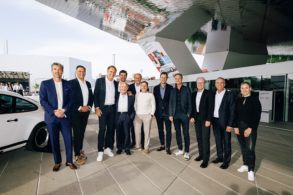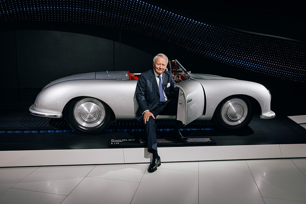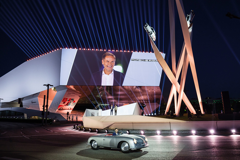 Am Ende seiner Rede kündigte er Dr. Wolfgang Porsche an, der seit vielen Jahren Aufsichtsratsvorsitzender ist. Dr. Porsche ließ sich in dem Sportwagen zur Bühne fahren, mit dem einst der Grundstein für den Mythos Porsche gelegt wurde. Der ehemalige Rennfahrer Mark Webber pilotierte den 356 „Nr. 1“ Roadster mit dem Mitglied der Gründerfamilie, das längst zur Identifikationsfigur der Marke geworden ist.