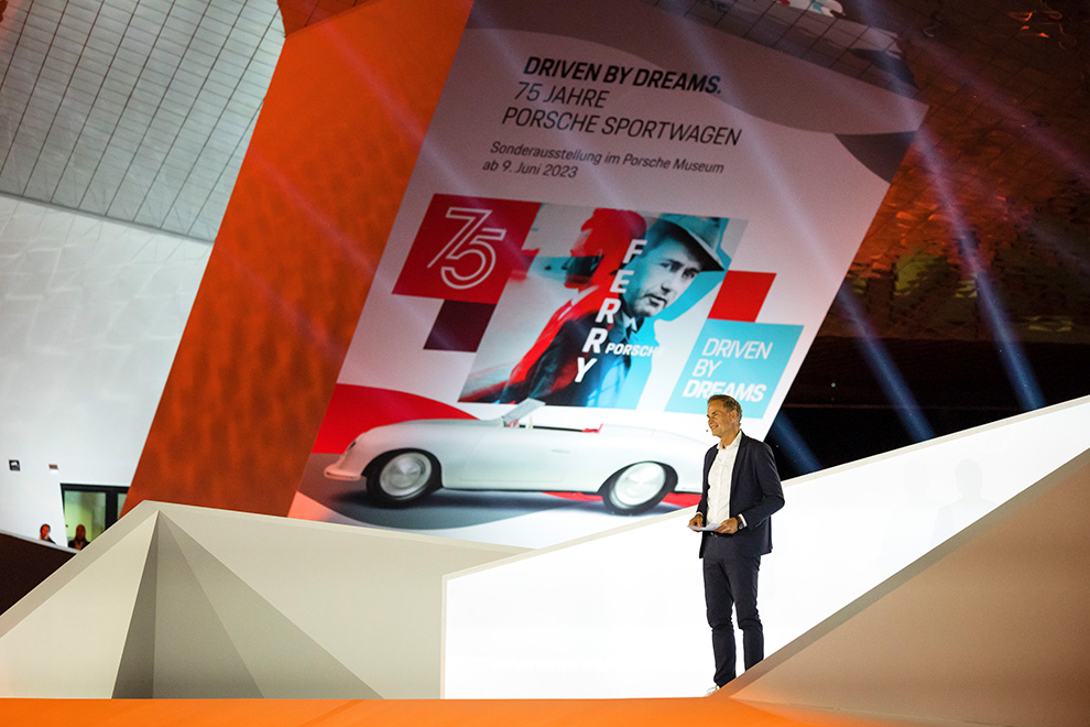 „Porsche verwirklicht Träume. Immer wieder gelingt es uns aufs Neue, unsere Kunden zu überraschen und zu begeistern. Mit faszinierendem Design. Mit wegweisender Technologie. Mit überzeugender Qualität. Seit 75 Jahren“, sagte Dr. Wolfgang Porsche vor 800 geladenen Gästen während des ersten Aktes „Heritage“. In weiteren vier Akten widmeten sich Zeitzeugen, Markenbotschafter und Porsche-Vertreter aus 75 Jahren Markengeschichte den Themen „Zeitgeist“, „Performance“, „Pioniergeist“ und „Träume“. Zwischen den Reden von Oliver Blume, Dr. Wolfgang Porsche, Designchef Michael Mauer, Dr. Frank-Steffen Walliser, Leiter Gesamtfahrzeug-Architektur und Markenbotschafter Timo Bernhard erlebten die Zuschauer spektakuläre Inszenierungen aus Musik, Licht und Choreografie. Je nach Akt untermalten die dazu passenden Sportwagen die Show mit Fahraktionen. Immer wieder wurde am Abend deutlich, dass Träume bei Porsche eine große Rolle spielen. Träume, die dank mutiger und leidenschaftlicher Pioniere wahr werden durften. Träume, die seit 75 Jahren fest in der Porsche-DNA verankert sind. Träume, die der Ursprung unvergesslicher Momente waren.