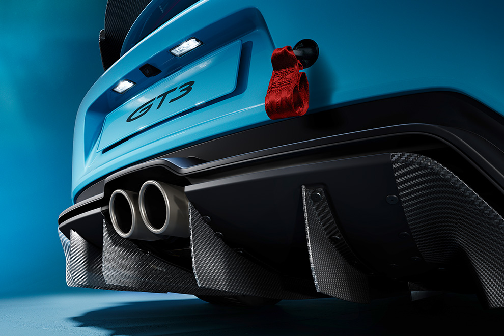 Wer weitere optische Akzente setzen möchte, kann seinen 911 GT3 mit besonders sportlichem Zubehör individualisieren. Türeinstiegsblenden aus Carbon mit beleuchtetem Manthey Schriftzug, LED-Türprojektoren mit weiß leuchtendem Manthey Schriftzug sowie die Möglichkeit, den Manthey-Schriftzug wahlweise auf den Türen anzubringen, unterstreichen den geschärften Charakter des 911 GT3. Ergänzend dazu sind die Carbon-Aerodiscs in verschiedenen Farben verfügbar. Für den Rundstreckeneinsatz stehen Bergelaschen für Front und Heck zur Verfügung. Diese sind wahlweise in Rot, Schwarz oder Gelb erhältlich und lassen sich im dafür vorgesehenen Gewinde am Bug- und Heckteil anbringen. Vor der Teilnahme am öffentlichen Straßenverkehr müssen sie wieder entfernt werden. Zusätzlich kann der 911 GT3 mit Front-Luftauslässen und Heck-Lufteinlässen aus CFK veredelt werden.