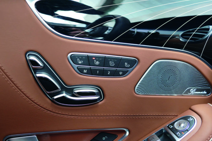 Wo er fährt, ist immer Genuss-Region. Auf immerhin 10 m² eröffnet sich dem Auto-Gourmet feudaler Luxus, vorne sehr intensiv, hinten Coupé-bedingt etwas dezenter, auch wenn das Frontgestühl leise surrend vorgleitet und den Zustieg freigibt. Eine opulente Leder-Landschaft, abgesteppt und perforiert, mattiert-silberne Einlagen, dunkel glänzendes Holz „designo Klavierlack schwarz“ mit edel wirkenden, hellen Streifen – „flowing lines“ – um immerhin