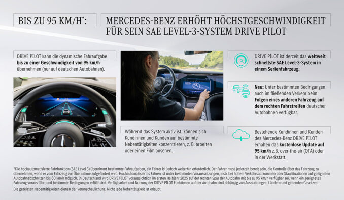 Auf der Autobahn kann DRIVE PILOT unter bestimmten Bedingungen die Fahraufgabe übernehmen. Bisher galt dies für Geschwindigkeiten mit 60 km/h im Stau. Nun ist es auch mit 95 km/h im normalen Verkehrsfluss hinter einem vorausfahrenden Fahrzeug auf der rechten Autobahnspur möglich. Somit können Kundinnen und Kunden öfter und länger hochautomatisiert fahren und ihre Zeit während der Fahrt noch besser nutzen. Bei aktiviertem DRIVE PILOT ist es gestattet, sich anderen Tätigkeiten zu widmen. Fahrerinnen und Fahrer können beispielsweise Filme schauen, Zeitung lesen, arbeiten oder sich ganz einfach entspannen, während der Mercedes hochautomatisiert fährt.