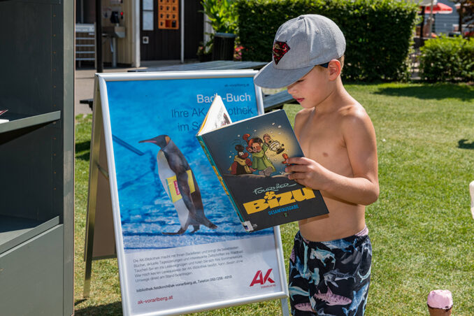 Im Waldbad Feldkirch und im Bludenzer Val Blu bietet die AK-Bibliothek den ganzen Sommer über Unterhaltsames von der Tageszeitung bis zum Roman. Im Waldbad können seit heuer auch Spiele ausgeliehen werden.