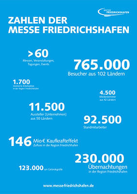 Auch für die Region Friedrichshafen kann Klaus Wellmann, Geschäftsführer der Messe Friedrichshafen, imposante Zahlen nennen: „Unsere Messen mit 11 500 ausstellenden Unternehmen und 92.500 Standmitarbeitern ziehen 765 000 Besucher aus 102 Ländern an. Dabei generieren wir für die Region über 230 000 Übernachtungen. In der Summe führt dies zu einem jährlichen regionalen Kaufkraftzufluss von 146 Millionen Euro und zu 1.700 involvierten Arbeitsplätzen. Das ist optimale Wirtschaftsförderung für die Stadt Friedrichshafen, den Landkreis Bodensee sowie die umliegenden Landkreise und das Land Baden-Württemberg.“