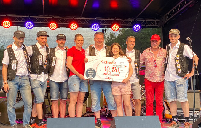 Die Teilnehmer des 3. Vorarlberger Moped Rides, der am 4. Juni 2022 über die Vorarlberger Straßen führte, zeigten ein großes Herz für Kinder. Viele haben auf ihre bezahlte Chipkaution verzichtet und diese an die Herzkinder Österreichs gespendet. So kam der stattliche Betrag von EUR 10.920,- zusammen. Die Scheck-Übergabe erfolgte bei der Mohren-Moped-Party auf dem Dornbirner Messegelände.