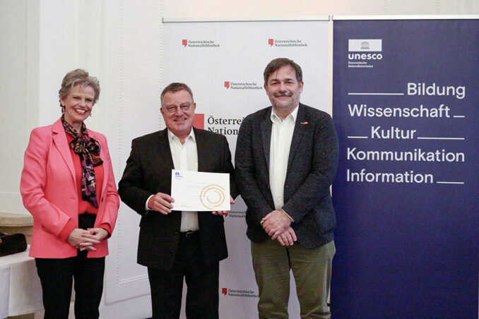 Die Vorarlbergerin Dr. Sabine Haag, Präsidentin der Österreichischen UNESCO-Kommission, überreichte dem Obmann des Wirtschaftsarchivs Vorarlberg, DDr. Arno Fitz, sowie dem Obmann-Stv. und Kassier Karlheinz Kindler in einer feierlichen Zeremonie in der Österreichischen Nationalbibliothek die Aufnahmeurkunde. Unter den weiteren acht Neueintragungen befinden sich beispielsweise die Khevenhüller-Chronik von Georg Moshamer im Museum für angewandte Kunst in Wien, die habsburgisch-jagiellonischen Doppelheiratsverträge von 1515 im Österreichischen Staatsarchiv oder Max Reinhardts Regiebuch zu Hoffmannsthals Jedermann im Archiv der Salzburger Festspiele.