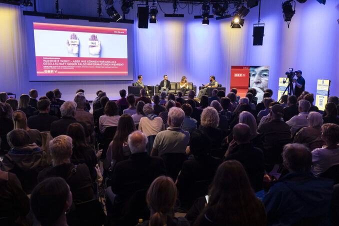 Höhepunkt des Tages war die Podiumsdiskussion im voll besetzten Publikumsstudio. Expertinnen und Experten aus Journalismus, Wissenschaft und Medienpädagogik beleuchteten die Gefahren von Desinformation und diskutierten Möglichkeiten, wie Gesellschaft, Medien und Technologie gemeinsam gegen Fake News vorgehen können. Themen waren unter anderem neue digitale Werkzeuge zur Rückverfolgung von Quellen, die Verantwortung klassischer Medien und die Bedeutung von Medienkompetenzvermittlung bereits in jungen Jahren.