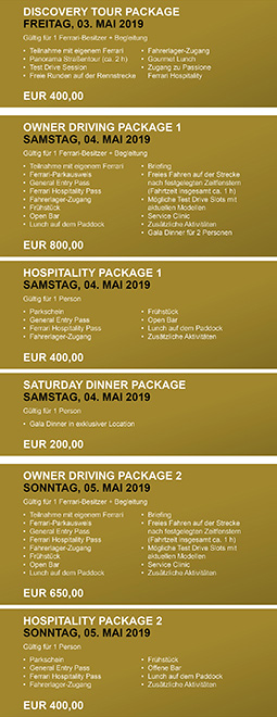 Folgende exklusiven Passione Ferrari-Pakete versprechen sowohl Ihnen als auch Ihrer Begleitung ein unvergessliches Ferrari-Wochenende: