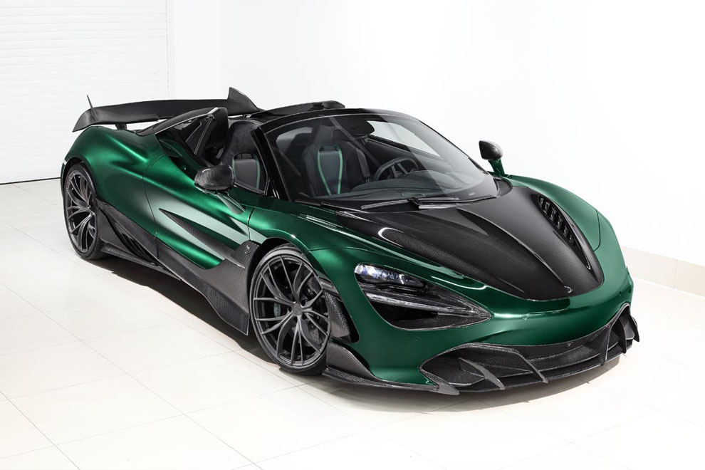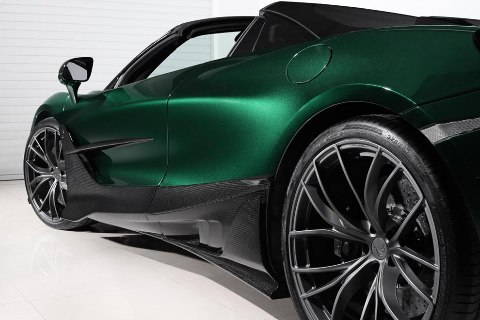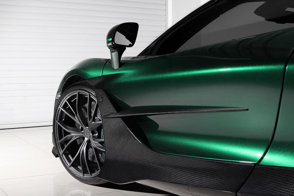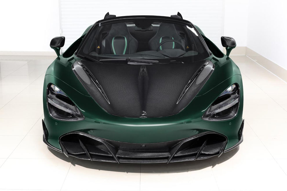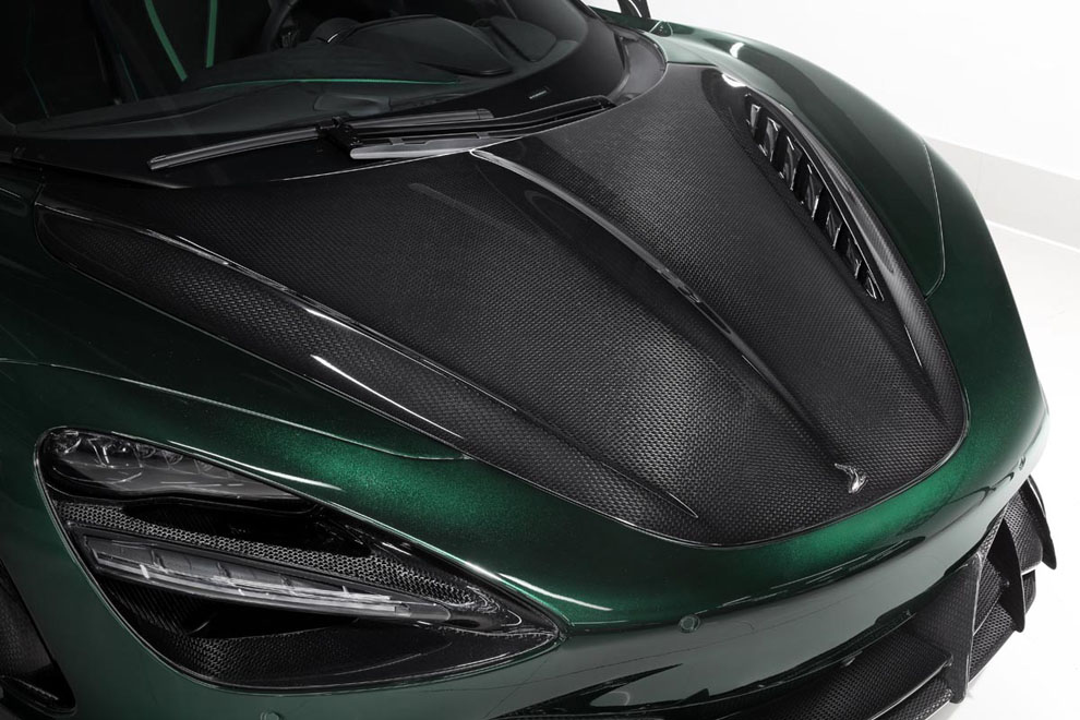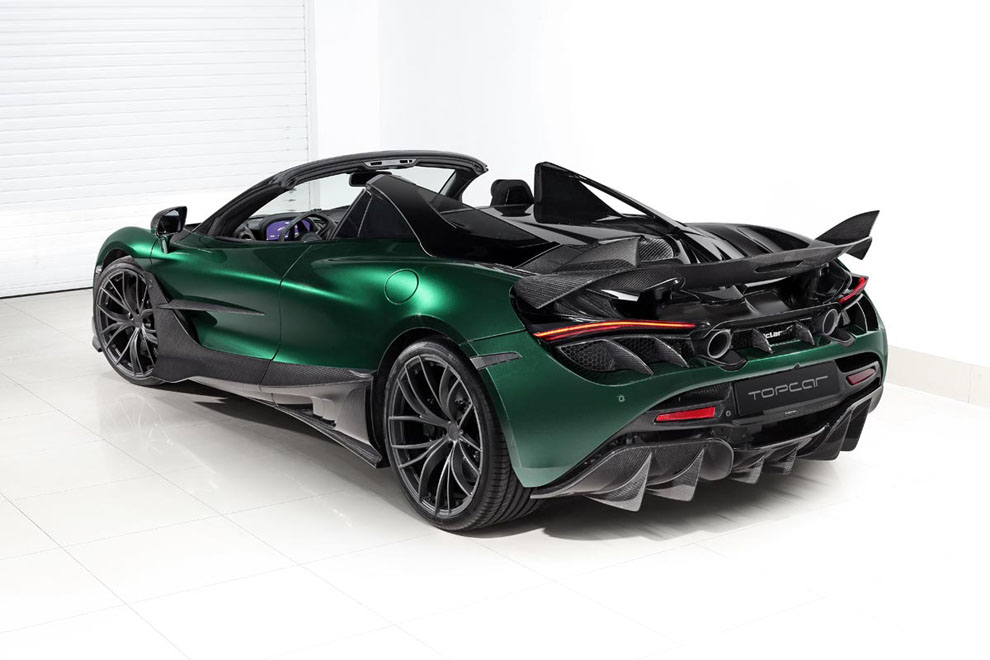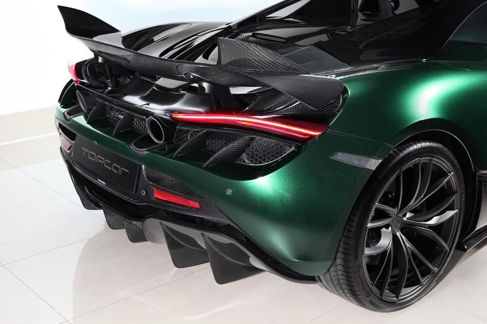 Der Bausatz besteht aus 50 Teilen und ist bei dem ersten realisierten Exemplar, einem 720S Spider, in der nochmals exklusiveren Stealth Edition installiert. Alle Komponenten sind aus Carbon gefertigt und da TopCar auf eine farbige Lackierung verzichtet, ist die gräuliche Faserstruktur des Werkstoffs bestens ersichtlich, womit ein toller Kontrast zu der dunkelgrünen Lackierung der Karosserie entsteht. Den Bug veredeln ein Schürzeneinsatz, Rahmen für die Scheinwerfer-Lufteinlass-Kombination sowie eine mehrteilige Spoilerlippe und ein Frontdeckel mit seitlichen Kiemen. Besonders großflächig sind die seitlichen Aufsätze für den Flankenbereich, die auf den Türen teilweise fast bis zur Gürtellinie reichen. Das Heck veredeln ein Diffusor, Blenden für die Abdeckungen unterhalb derer der Achtzylinder liegt, Einsätze für die Schürze und ein Heckflügel, der zwei auffällige Finnen trägt – in Anlehnung an das TopCar-Logo, einen Hai. Eine perfekte Abrundung des neuen Designs sind die geschmiedeten TopCar Fury Style-Felgen in 9×20 Zoll und 11,5×21 Zoll mit Hochleistungsbereifungen in 255/30 ZR20 und 325/25 ZR21.
