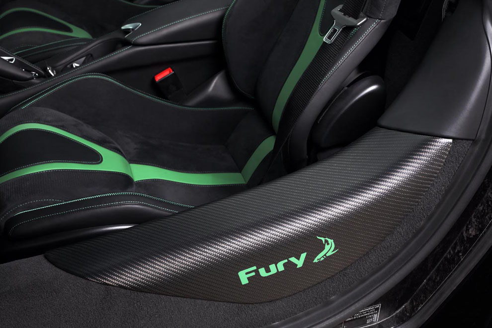 Das schon werksseitig mit unter anderem Carbon-Elementen am Lenkrad ausgerüstete Cockpit zeigt eine komplette Neuausstattung mit Leder und Alcantara. Sie ist farblich in Schwarz und Dunkelgrün bestens auf das Exterieur abgestimmt. Besonderes Highlight sind die Carbon-Applikationen an den Einstiegen, die bei geöffneter Tür einen außenliegenden „Fury“-Schriftzug mit TopCar-Logos offenbaren.