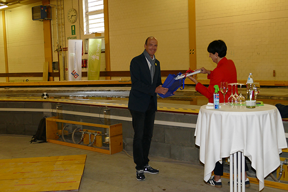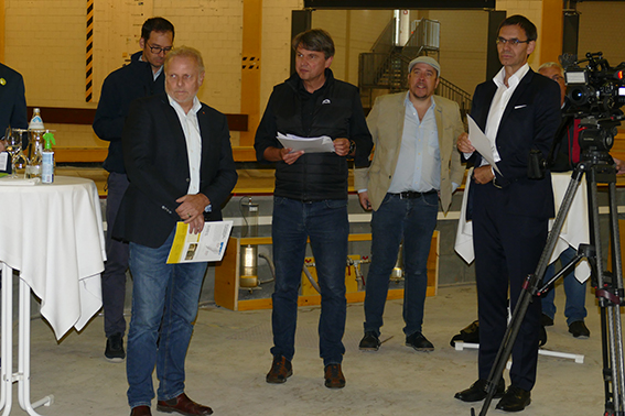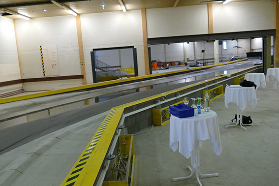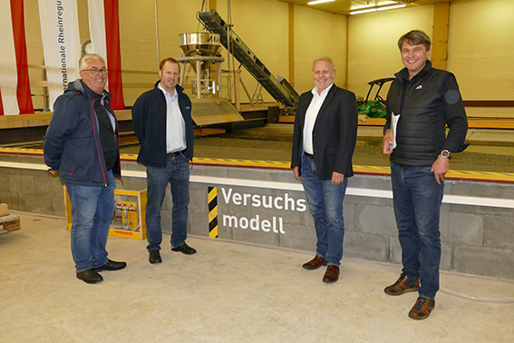 In der wasserbaulichen Modellversuchshalle in Dornbirn wurde das rund 100 Meter lange Modell des Rheins umgebaut. Neu zeigt es erstmals den Abschnitt zwischen Widnau und Höchst nach Umsetzung des Projekts Rhesi. In Anwesenheit der St. Galler Regierungsrätin Susanne Hartmann und des Vorarlberger Landeshauptmann Markus Wallner informierten Heinz Stiefelmeyer, Vorsitzender der Gemeinsamen Rheinkommission, und Markus Mähr, Gesamtprojektleiter Rhesi, die Öffentlichkeit über den aktuellen Stand des Projekts.