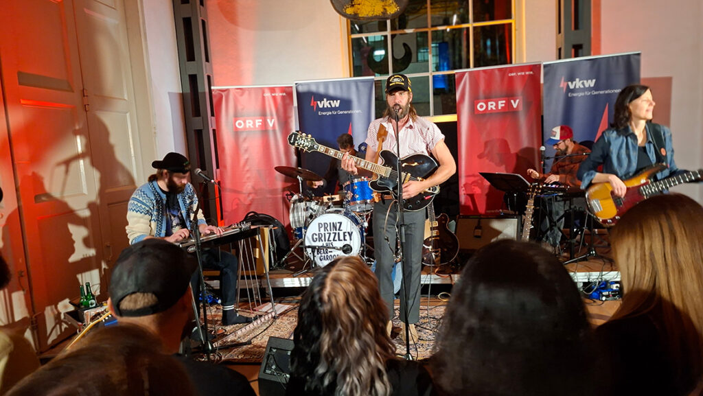 Im Oktober drehte sich bei der „ORF Radio Vorarlberg-Stromgitarre“ alles um legendäre Gitarrensoli der Rockgeschichte. Es galt täglich einen Song oder Interpreten anhand kurzer Gitarrensolo-Einspielungen zu erkennen. Dabei waren unter anderem „Where the streets have no name“ von U2, „Layla“ von Eric Clapton, „Fly away“ von Lenny Kravitz, „More than a feeling“ von Boston oder „Jump“ von Van Halen. Insgesamt 15 Gewinnerinnen und Gewinner durften nun mit jeweils neun Begleitpersonen beim Exklusivkonzert mit energiegeladenem Sound von Prinz Grizzley & his Beargaroos mitfeiern. Der Vorarlberger Musiker aus dem Bregenzerwald versteht es aufs Beste, Country und Americana authentisch auf die Bühne zu bringen. Seine ausdruckstarke Stimme und seine tiefgründigen Songtexte begeisterten die Partygäste.