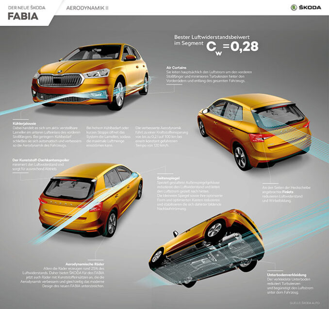 Zahlreiche Details leisten beim neuen Škoda Fabia ihren Beitrag zur besten Aerodynamik seiner Klasse. Eine wichtige Maßnahme ist die neuartige Kühlerjalousie im unteren Lufteinlass des vorderen Stoßfängers, die mit dem Fabia erstmals überhaupt in dieser Fahrzeugklasse zum Einsatz kommt. Bei geringem Kühlbedarf schließen sich die aktiven Lamellen und verbessern so die Aerodynamik. Bei einem konstant gefahrenen Tempo von 120 km/h ermöglicht das eine Kraftstoffeinsparung von bis zu 0,2 l/100 km. Pro gefahrenem Kilometer stößt der FABIA damit bis zu fünf Gramm weniger CO₂ aus. Bei hohem Kühlbedarf oder kurzen Stopps öffnet das System die Lamellen, sodass die maximale Luftmenge einströmen kann. Darüber hinaus sorgen zahlreiche Bauteile für einen optimalen Luftwiderstand. An der Fahrzeugfront wird der Luftstrom durch Aussparungen im vorderen Stoßfänger, sogenannte Air Curtains, aerodynamisch besonders günstig seitlich eng an der Karosserie und den Rädern vorbeigeführt. Unter dem Fahrzeug optimiert ein jetzt mit zwölf statt zuvor drei Abdeckungen verkleideter Unterboden den Luftfluss. Im Zusammenspiel mit dem langen Dachspoiler und seitlichen Finlets reduziert das die Luftverwirbelungen hinter dem Fahrzeug, den sogenannten Hecknachlauf. Die Form der Außenspiegel leitet die Luft gezielt zu den Abrisskanten an den Heckleuchten. Da allein die Räder rund 25 Prozent des Luftwiderstands erzeugen, verwendet Škoda erstmals auch beim Fabia spezielle Kunststoffeinsätze, um die Leichtmetallräder aerodynamisch zu optimieren.