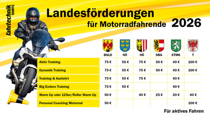 Zusätzlich wird die Teilnahme in vielen Bundesländern finanziell unterstützt: Niederösterreich, Oberösterreich, Tirol, Steiermark, Salzburg und das Burgenland fördern Motorradtrainings mit bis zu 100 Euro. Details zu Voraussetzungen und weitere Informationen unter: www.oeamtc.at/fahrtechnik/motorrad.