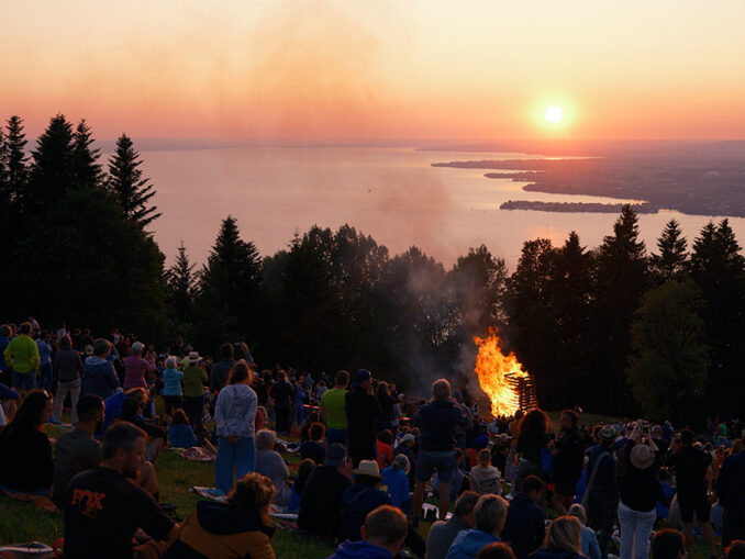 Wenn der längste Tag und die kürzeste Nacht aufeinandertreffen, lädt die Pfänderbahn auch in diesem Jahr wieder zum traditionellen Sonnwend-Fest. Allein schon die sechsminütige Abend-Seilbahnfahrt ist ein Vergnügen. Bregenz zeigt sich aus der Vogelperspektive und der Bodensee wird immer weiter und größer. Bei der Bergstation angekommen, geht es rund 20 Gehminuten zur Festwiese am Maldonahang. Mit Weitblick auf den Bodensee gibt es hier ab 18:00 Uhr Bewirtung, musikalisch begleitet von den Bregenzer Stadtmusikanten. Gegen 21:00 Uhr, wenn die Sonne im Bodensee versinkt, wird das Sonnwendfeuer entzündet. Dazu spielen Alphornbläser auf.