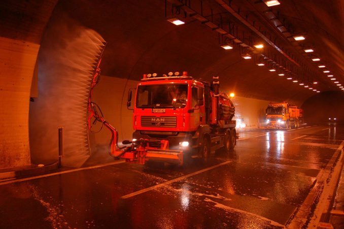 Zwei Mal pro Jahr heißt es „Alles waschen und putzen“ in den Tunnel. Nur so kann gegen die Ablagerungen von Staub, Ruß und Schmutz während der Wintermonate angekämpft werden. Vom Bordsteinreflektor über die Beleuchtung bis hin zu den Notrufnischen – alles wird geputzt und somit die Sichtbarkeit erhöht. Defekte Teile werden dabei sofort ausgetauscht – die Tunnel werden also fit für den Sommerreiseverkehr gemacht.