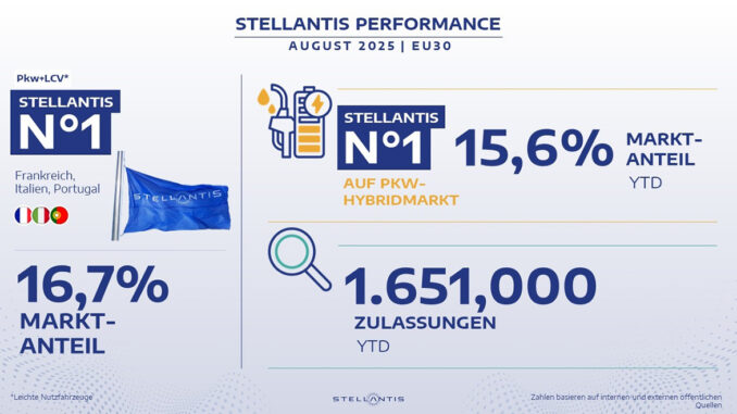 Stellantis bekräftigt seine starke Position auf dem europäischen Automobilmarkt und schließt die ersten acht Monate des Jahres mit über 1.650.000 Zulassungen ab. Das Unternehmen festigt seine Führungsposition in wichtigen Märkten wie Frankreich und Italien und bleibt im strategischen Hybridsegment führend.